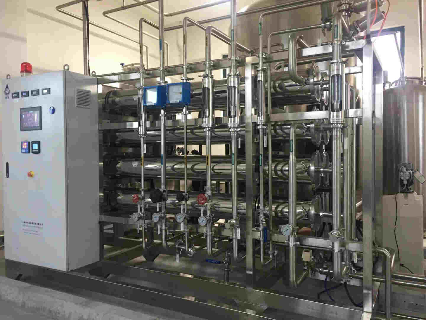 原水→原水泵→多介質(zhì)過濾器→活性炭過濾器→軟水器→精密過濾器→一級高壓泵→一級反滲透→中間水箱→二級高壓泵→二級反滲透→EDI泵→EDI系統(tǒng)→拋光樹脂→氮封水箱→用水點(diǎn)